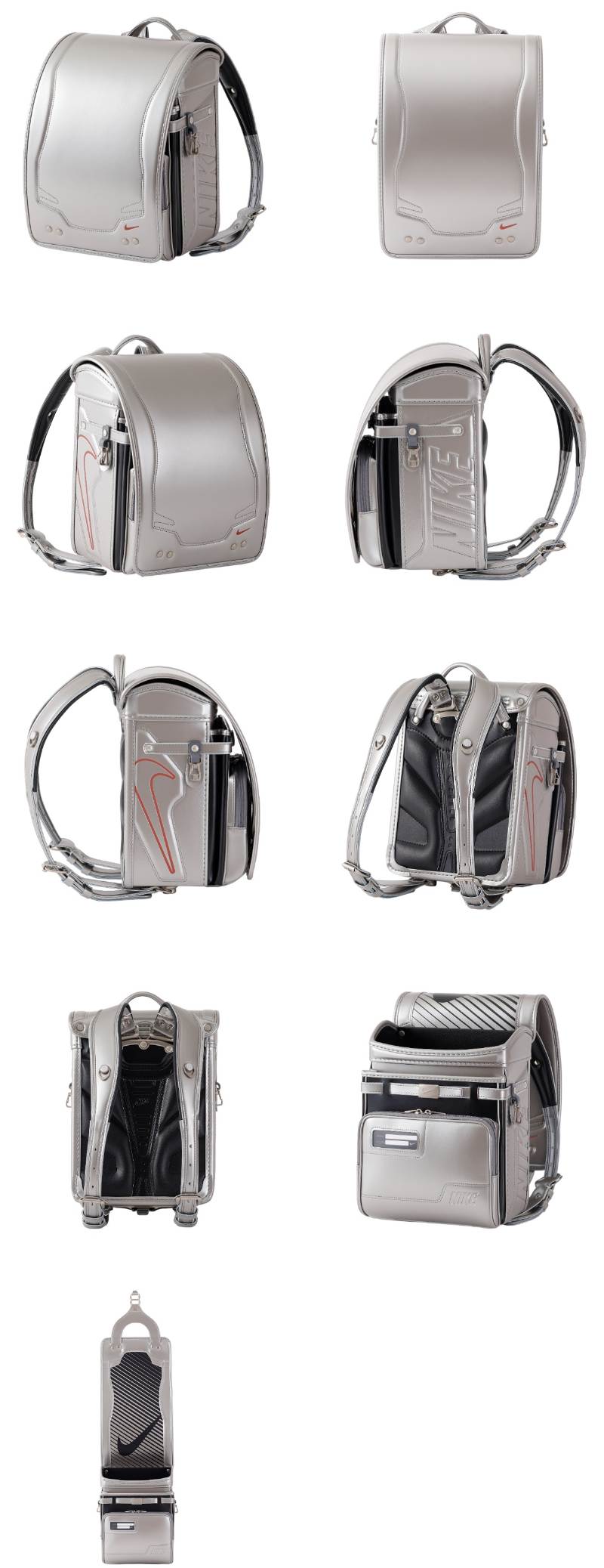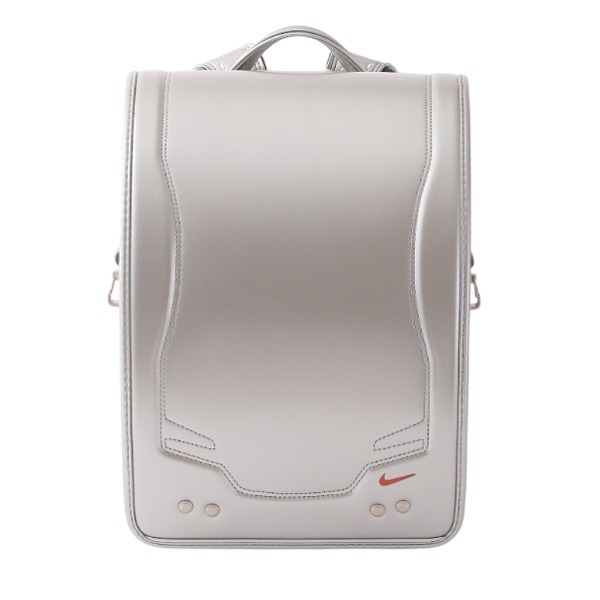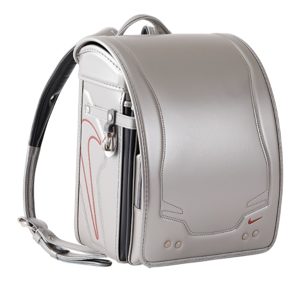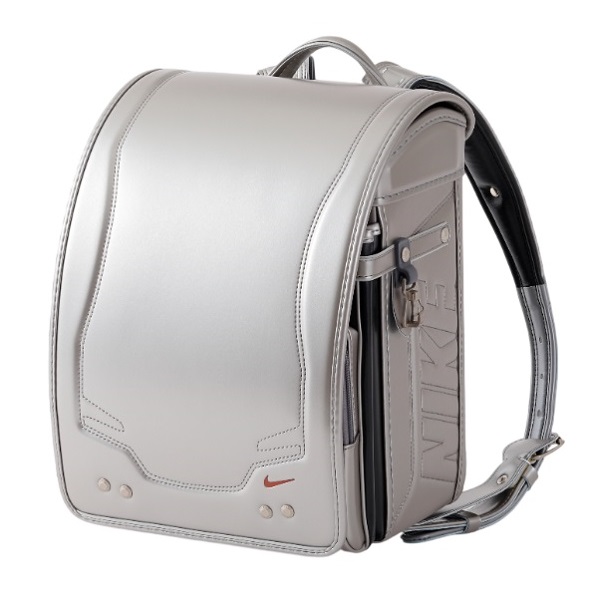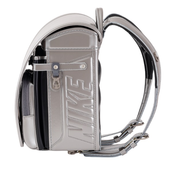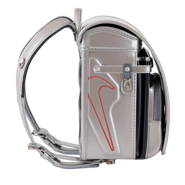 各所にナイキの表現が入った、スポーツテイストのランドセルです。オオマチとカブセのロゴマークは反射材になっております。また、金属部材にはナイキのロゴを刻印しています。