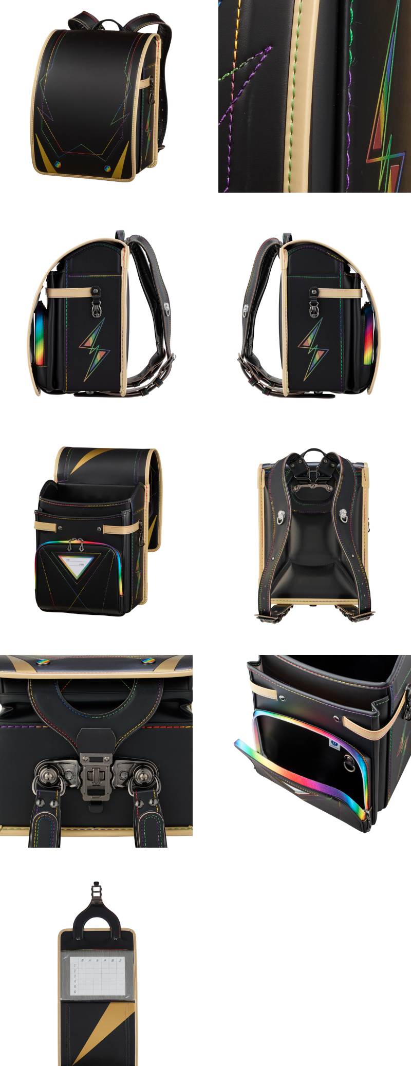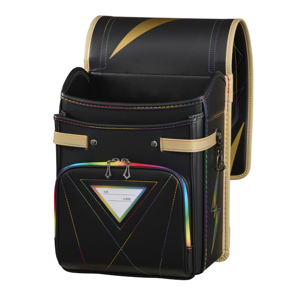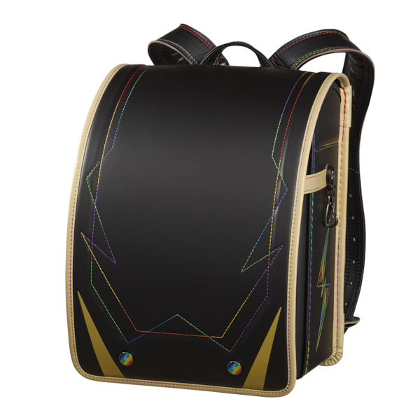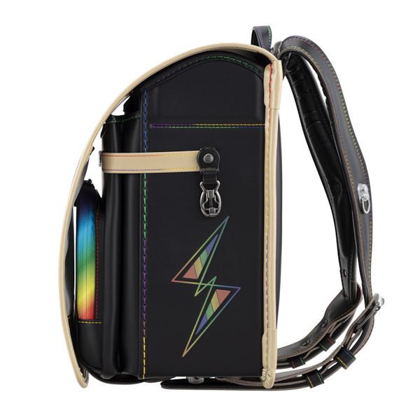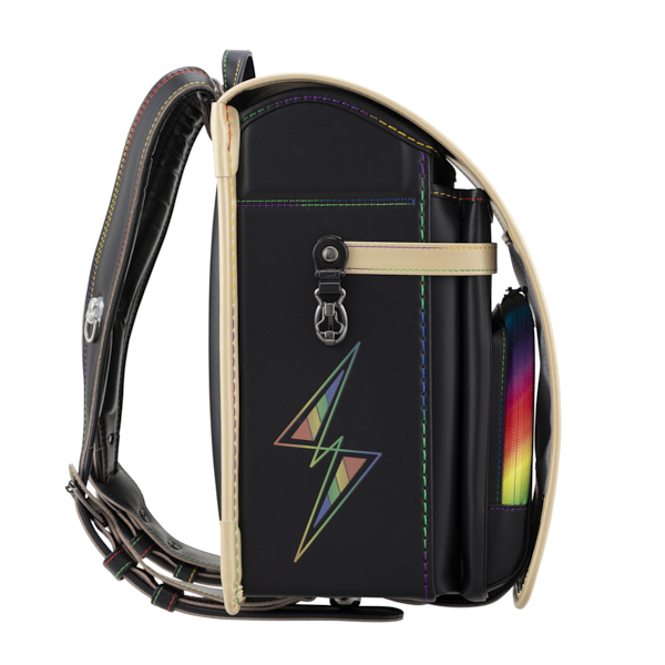 男の子が大好きなレインボーに特化したランドセル。ステッチはもちろん、かぶせ鋲、ファスナー、サイド反射材が全てレインボー柄。特にかしめはレインボーフォログラム調の中にイナズマ柄があり、かつ反射もする画期的なオリジナル鋲男の子では珍しい『見た目重視』なランドセル。