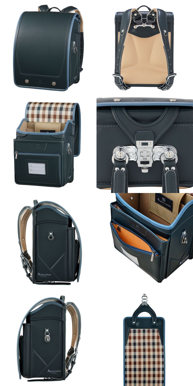 アクアスキュータムの紋章のカブセ鋲とカブセ裏には、アクアスキュータムのチェック柄を施しております。シンプルで高級感のあるデザインです。
