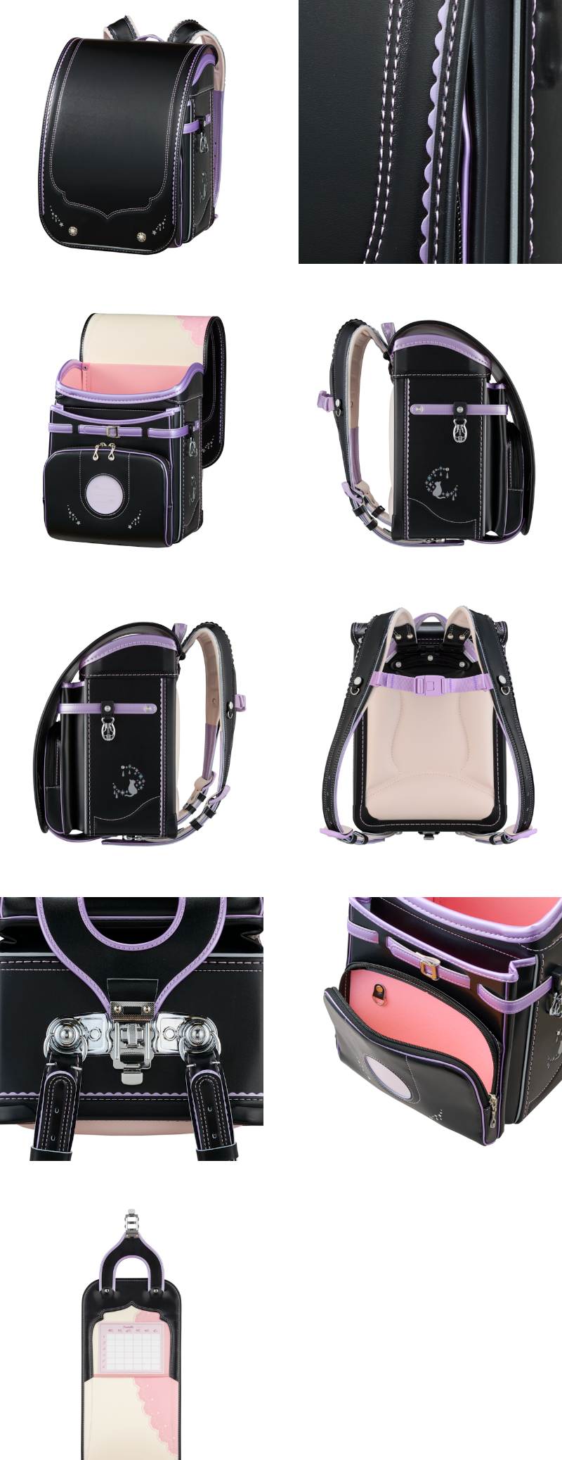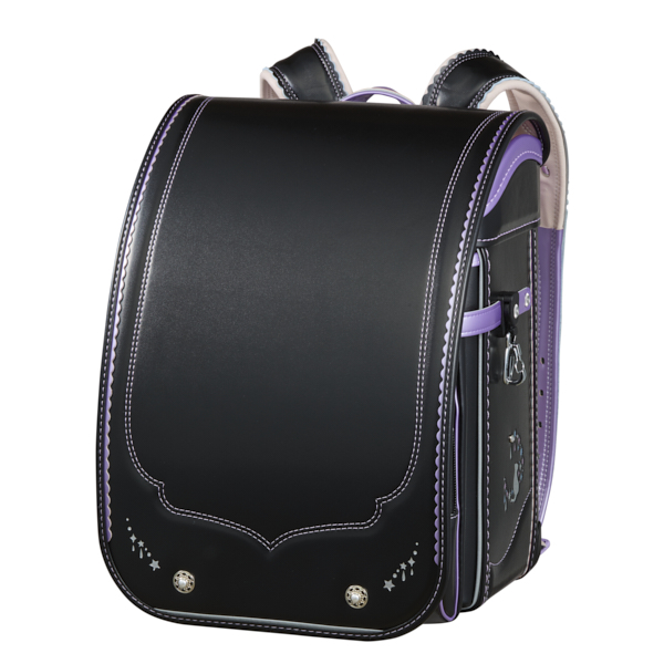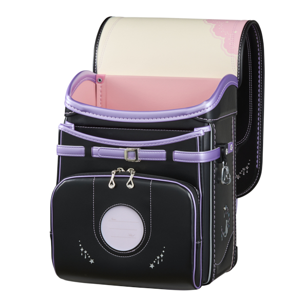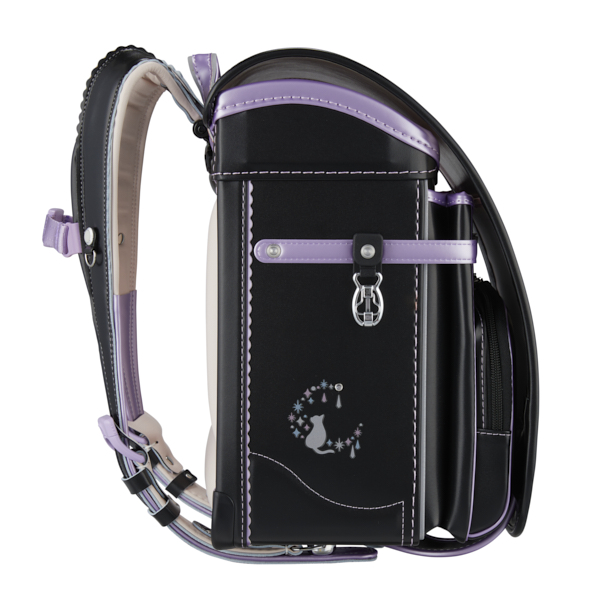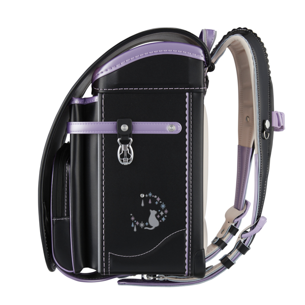 ネコをモチーフに採用したランドセル。大マチにはイメージに合うよう三日月と星をイメージさせるクリスタルポイントを取り入れました。