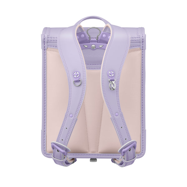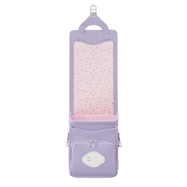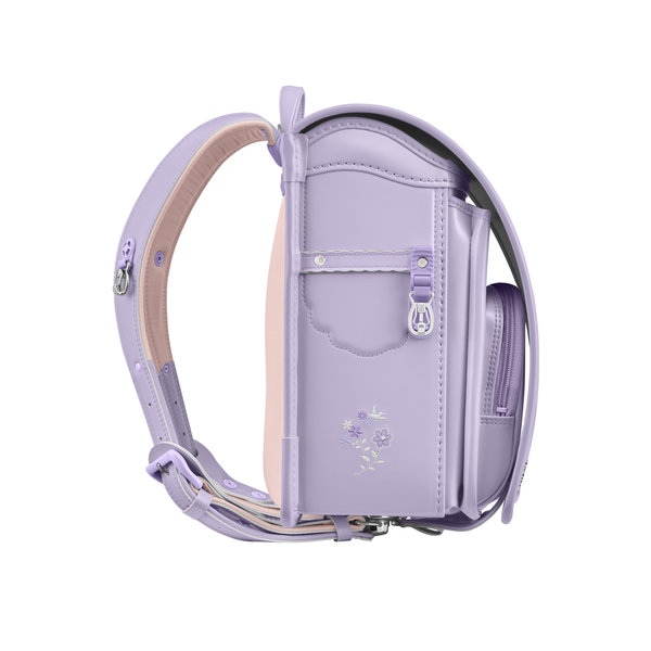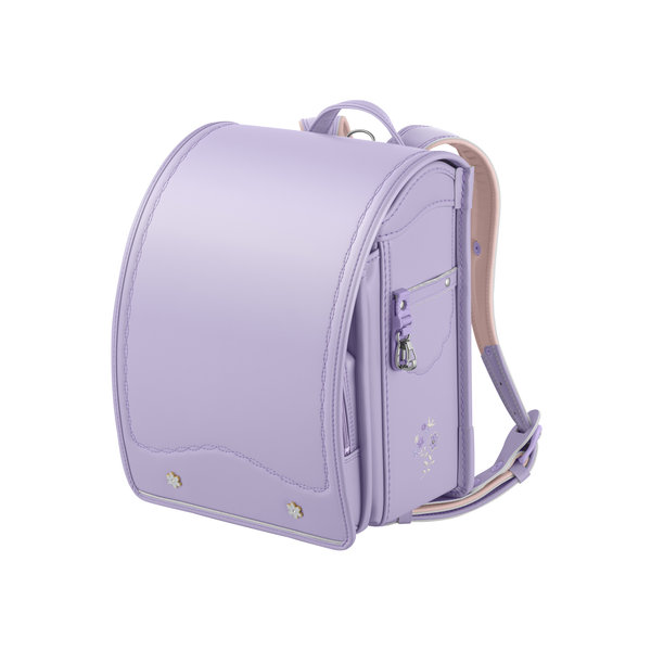 デザインコンセプトの『ナチュラルガーリー』をやわらかな生地カラーと小花の組み合わせで表現しています。クリスタル・ガラスが真ん中でキラリと輝くお花の刺しゅうと、立体的なお花をモチーフにした引き手が前ポケットのアクセントになっています。