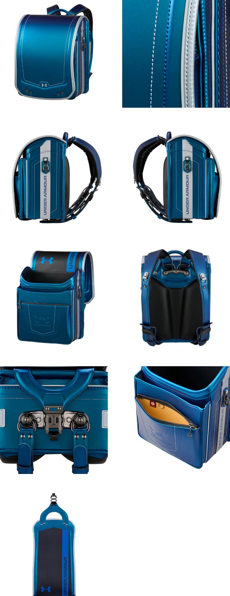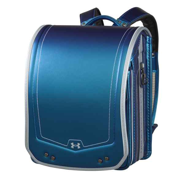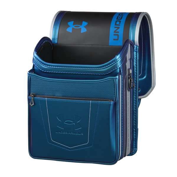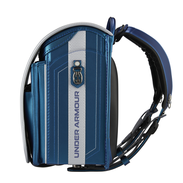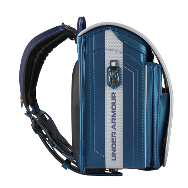 カブセにアンダーアーマーのロゴ反射、サイドには文字の反射を施しシャープで力強いデザイン。マシュマロクッション、ラチェットアジャスター、チェストベルト、13.5cmの大容量と多機能なランドセル。