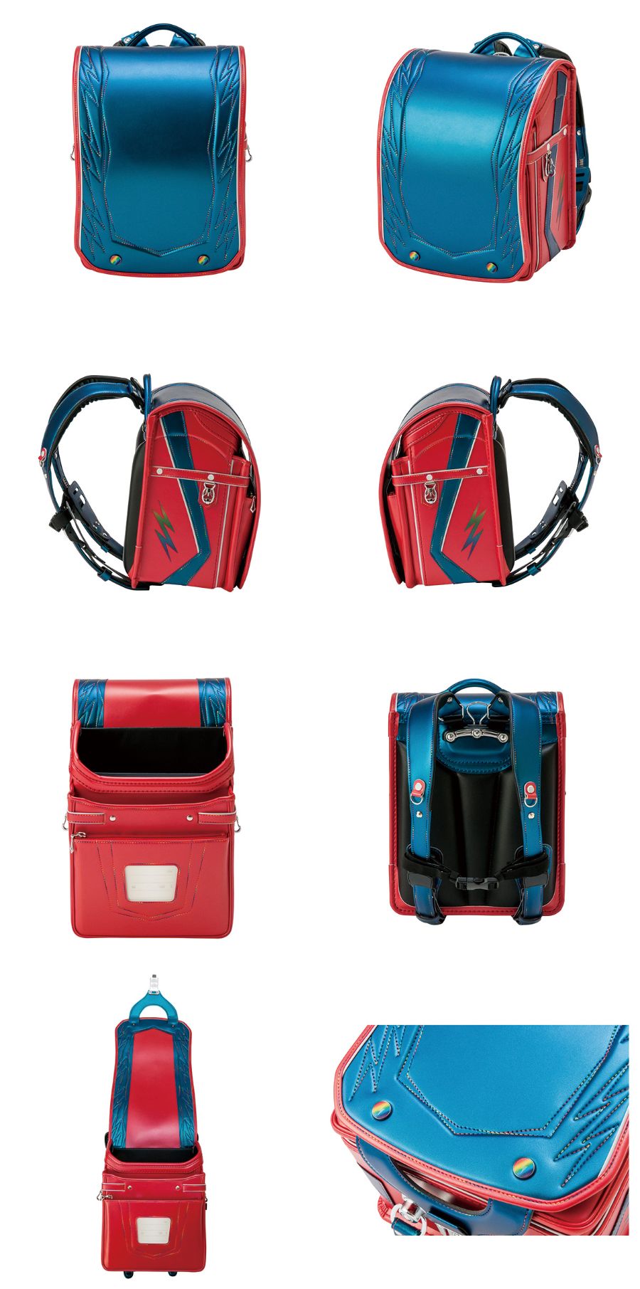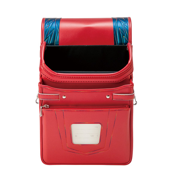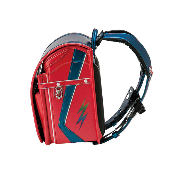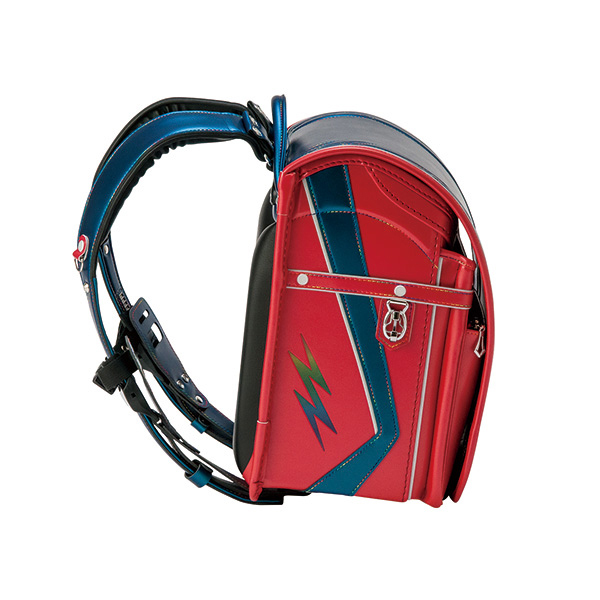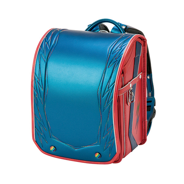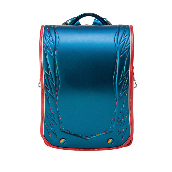 カブセにはレインボーステッチと鋲。大マチにはイナズマ型の反射をあしらいました。本体にもレインボーのステッチを多めに採用しています。