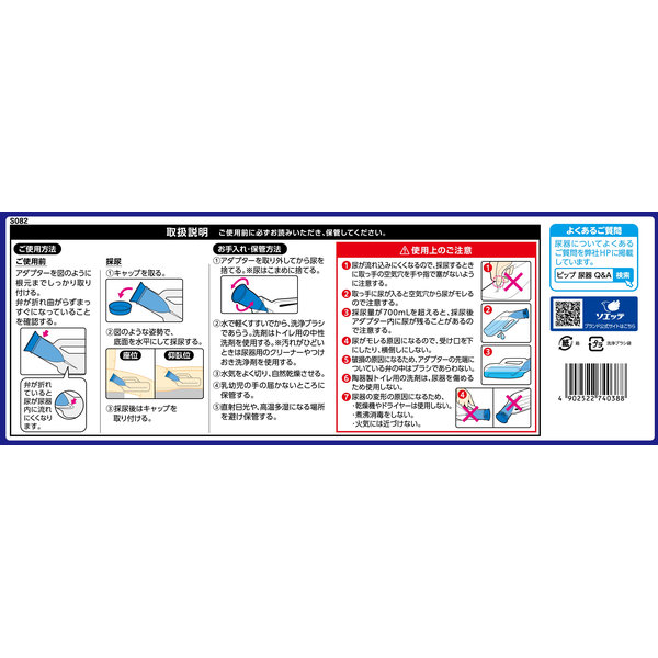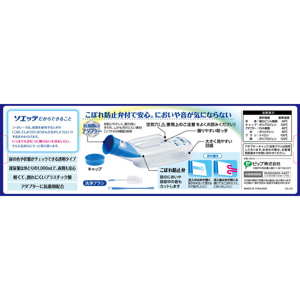こぼれ防止機能付透明尿器。尿のニオイがもれにくい。採尿時の音が気にならない。アダプターに抗菌剤配合。