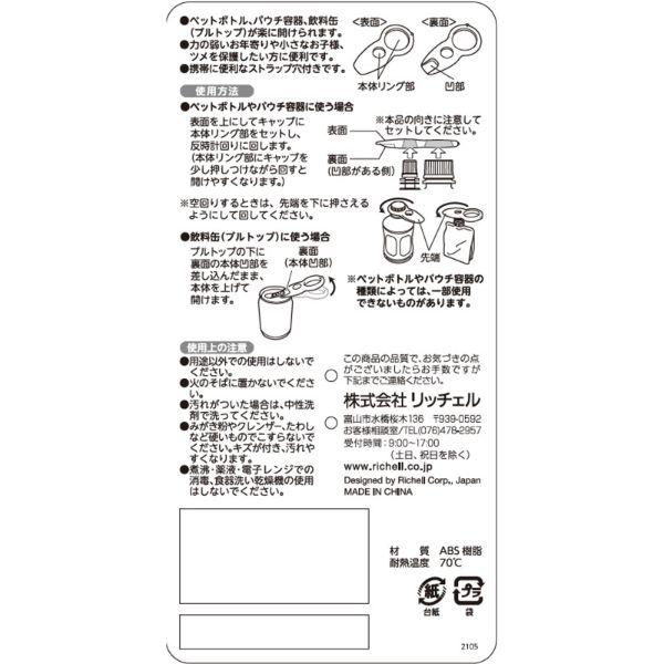 3種類のキャップをサッと開けられるオープナーです。力の弱いお年寄りや小さなお子様、ツメを保護したい女性に便利です。