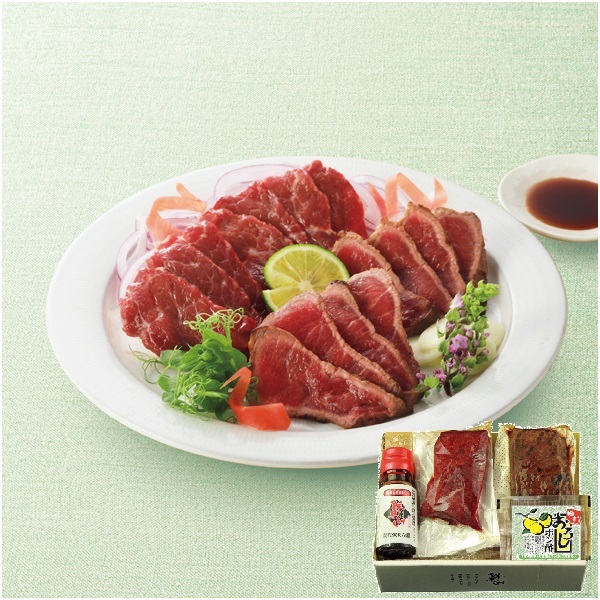馬刺し(赤身80g、たたき80g)(各原料:肉/カナダ又はフランス産)、たれ50ml、ぽん酢20g