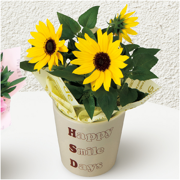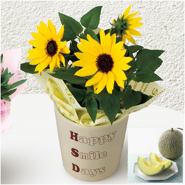 ひまわり(3.5号)、陶器鉢、高さ約18cm×鉢直径約12cm、メロン1個(2Lサイズ、1.6kg以上)