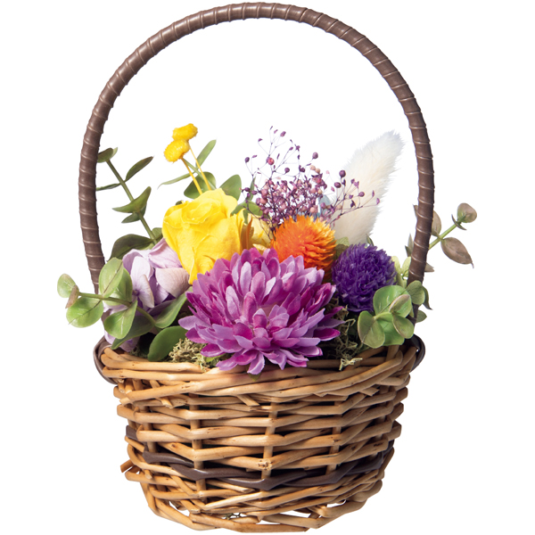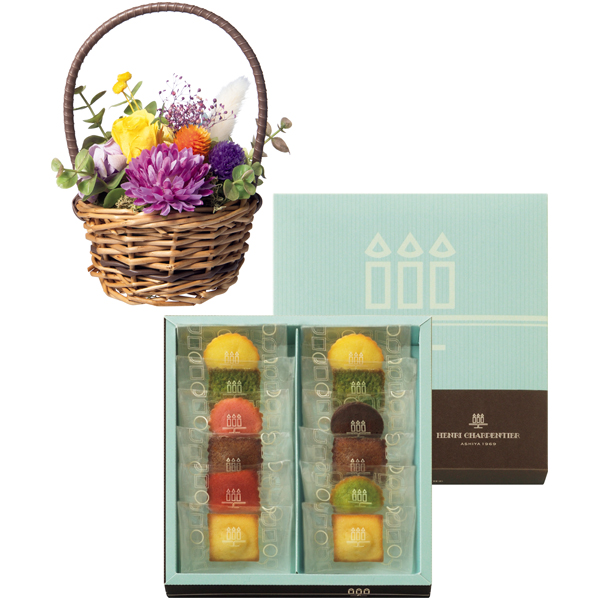 プティガトーアソルティ(フィナンシェ・マドレーヌ・キャラメル・抹茶 各2、ピスターシュ、フランボワーズ、ミルクチョコ、フレーズ)、プリザーブドフラワー((バラ、千日紅、アジサイ、カスミソウ)、ドライフラワー、造花、バスケット:幅約11×高さ約17cm)