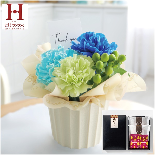 染めカーネーション(ブルー系2)、カーネーション(グリーン)、ヒペリカム、グリーン、プラスティック花器、高さ約17cm×幅約12cm、スイートポテト2、どら焼き2※染め花は人工的に染め上げておりますので、花の濃淡は個体差があります。