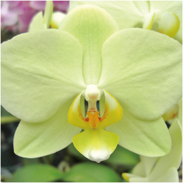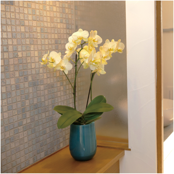 爽やかなイエローが人気の胡蝶蘭を水やりのタイミングが分かるガラス鉢に入れてお届けします。