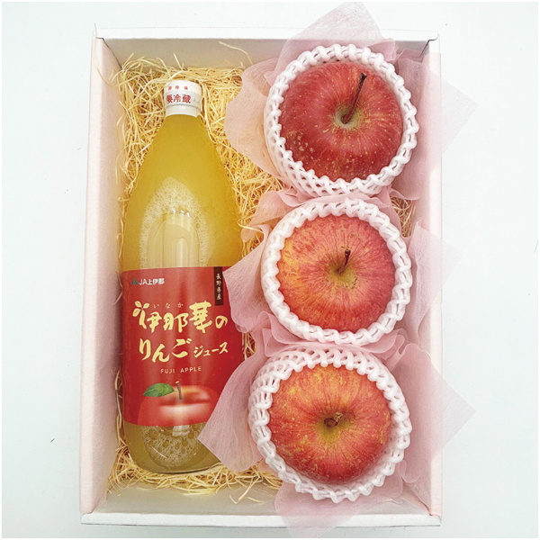 ふじりんご3個(1個300g以上)、りんごジュース(ストレート)1本(1000ml)※サイズ指定はご容赦ください。