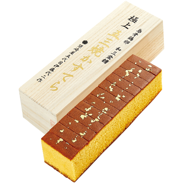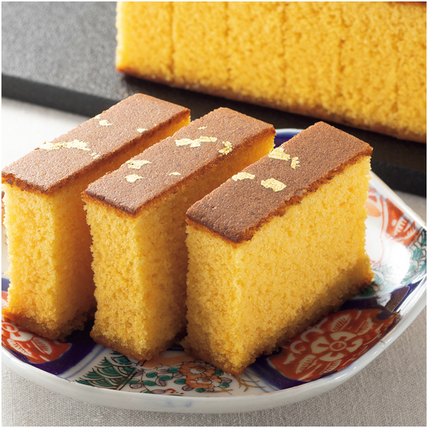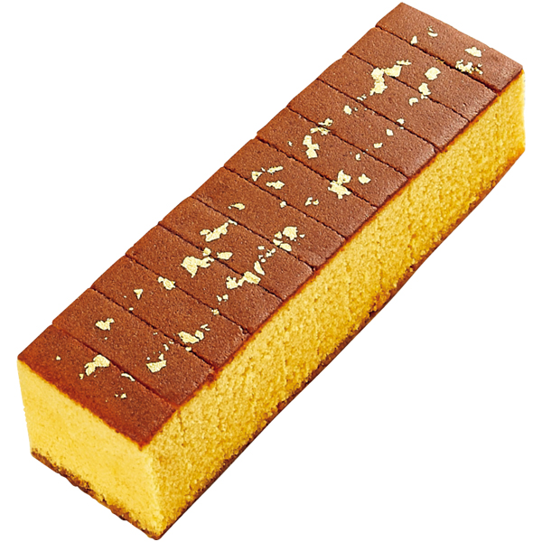 和三盆糖と烏骨鶏卵を配合して金箔をちらした、しっとりした食感の長崎かすてらです。