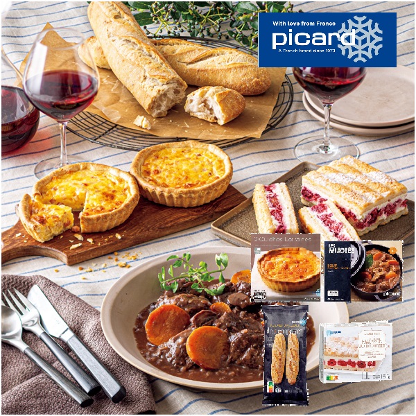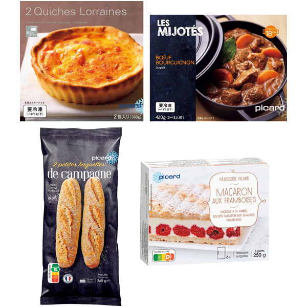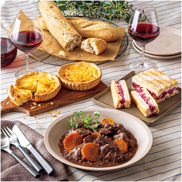 ロレーヌ風キッシュ(ベーコン入り)360g(2個入)、牛肉の赤ワイン煮420g(2~3人用)、ミニバゲット260g(2本入)、マカロン・オ・フランボワーズ250g(3人用)