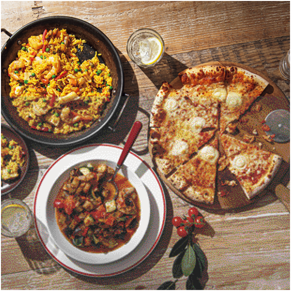 ピッツァやパエリア、ラタトゥイユなどを組合せた、地中海風の軽やかな食卓セットです。