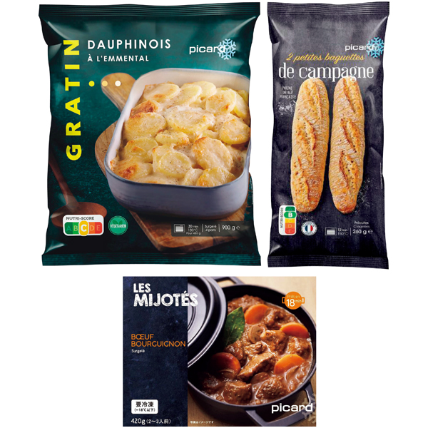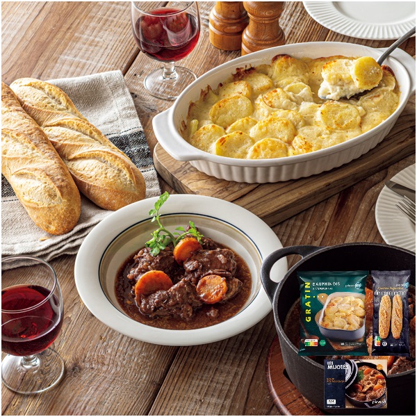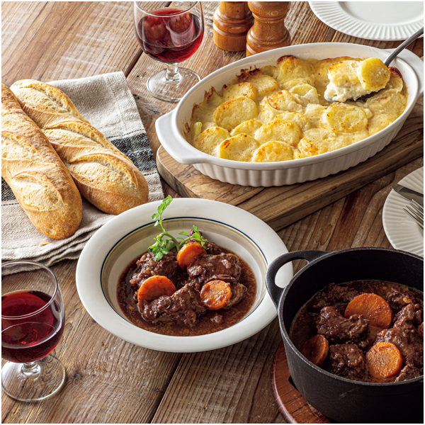 ジャガイモのクリームグラタン(大袋)900g、牛肉の赤ワイン煮420g(2・3人用)、ミニバゲット260g(2本入)