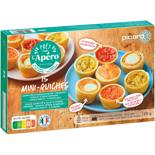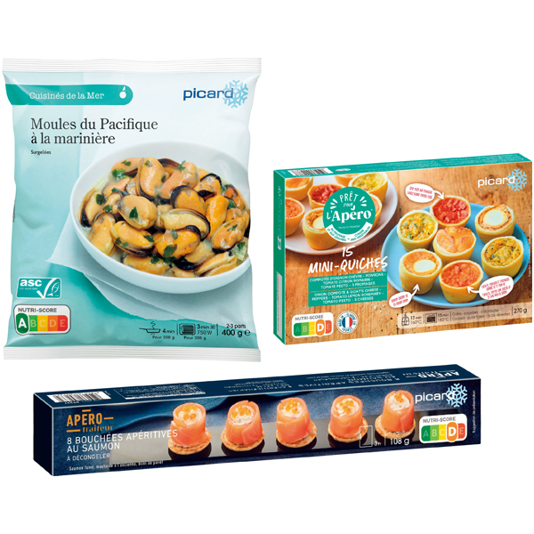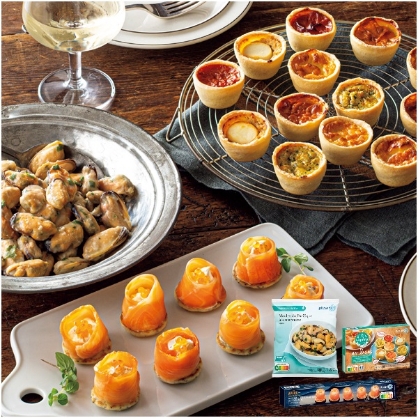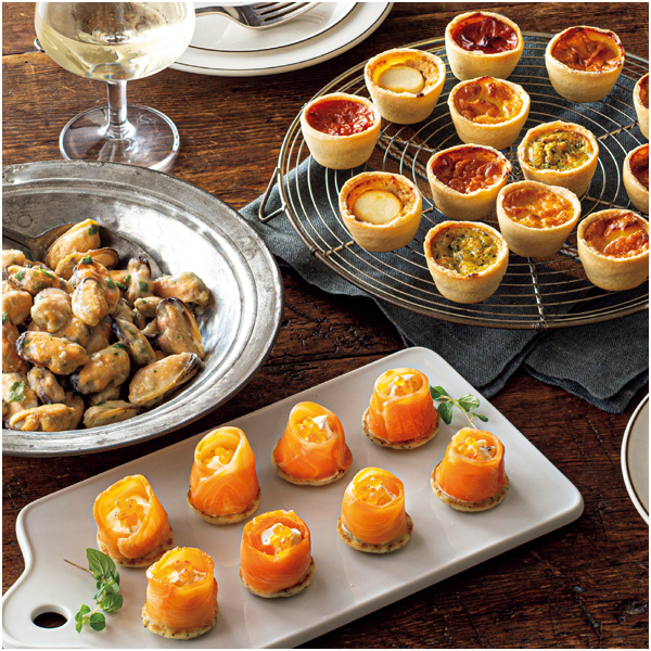 ムール貝の漁師風400g、5種類のミニキッシュ270g(15個入)、サーモンのブーシェ(ひと口サイズのアペリティフ)108g(8個入)