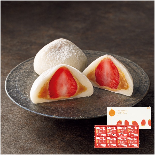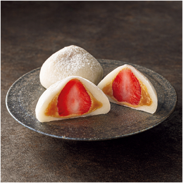 ジューシーで酸味のあるイチゴととろっと感がたまらないキャラメルソースを、国産もち米を使用した羽二重餅で包み込んだ大福です。