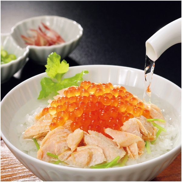 北海道日高沖の新鮮な秋鮭を原料に、醤油と清酒のみで味付けをしたいくら醤油漬。甘塩に仕立て焼き上げたほぐし身と、鰹節・焼きあごだし・昆布だしと椎茸エキスで旨みをプラスしただしをセットにいたしました。