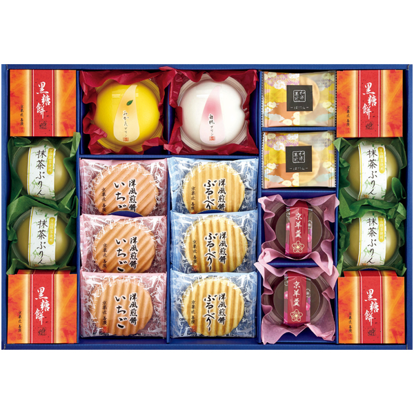 洋風煎餅(いちご・ぶるーべりー)各2枚入×3、京羊羹75g×2、和楽菓煎ばにら6、プリン(みかん・白桃)各135g、黒糖餅64g×4、抹茶ぷりん64g×4