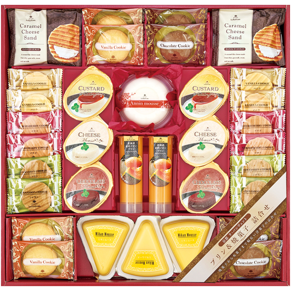キャラメルチーズサンド2、クッキー(バニラ・チョコ)各4、ミニョンバーグクッキー(バニラ・イチゴ・シナモン)各4、アンニンムース110g、赤肉メロンプリン95g×2、カスタードプリン65g×2、ムース(チョコ・チーズ)各65g×2、ミカンムース105g×3