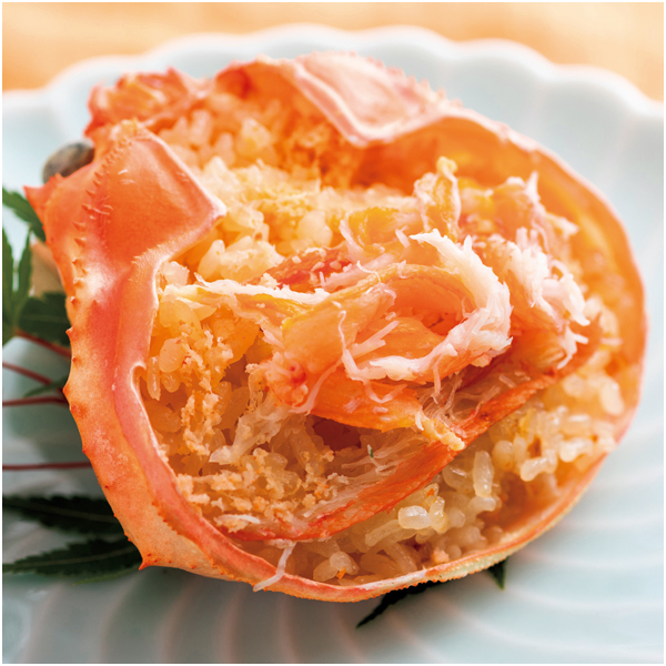 香住ガニと香住産バイ貝で炊き込んだ旨みたっぷりのご飯にカニ身をトッピング。甲羅が風味を増し、本格的な甲羅めしをご賞味ください。