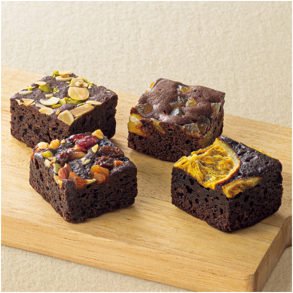 香ばしいナッツや甘酸っぱいフルーツをトッピングしたブラウニーです。