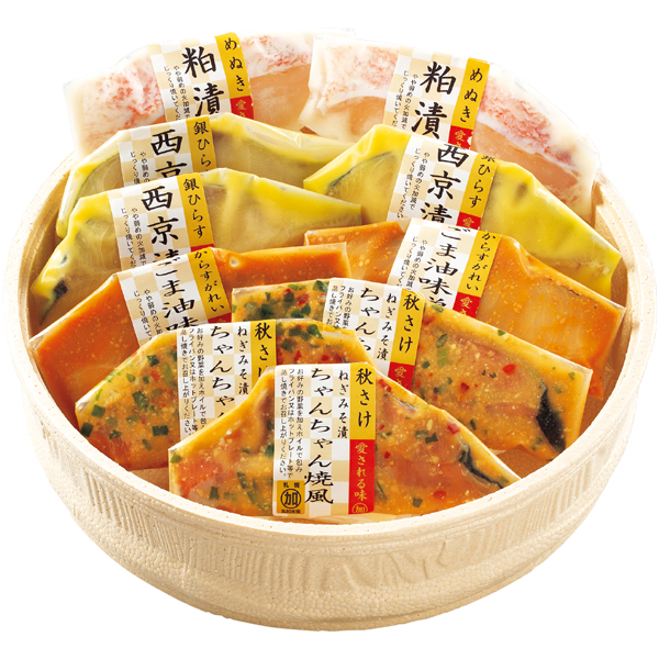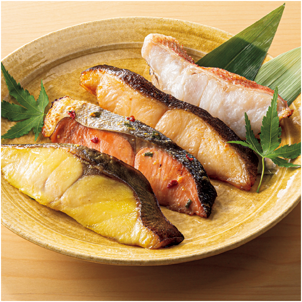 秋さけねぎ味噌漬50g・銀ひらす西京漬50g 各3、めぬき粕漬50g・からすがれいごま油味噌漬50g 各2 計10