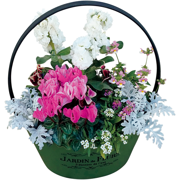 幅約30cm、奥行き約20cm、高さ約28cm、ガーデンシクラメン、ストック、スィートアリッサム(2種)、ネメシア、ビオラ、ダスティーミラー、SUSTEE(水分計、Mサイズ)