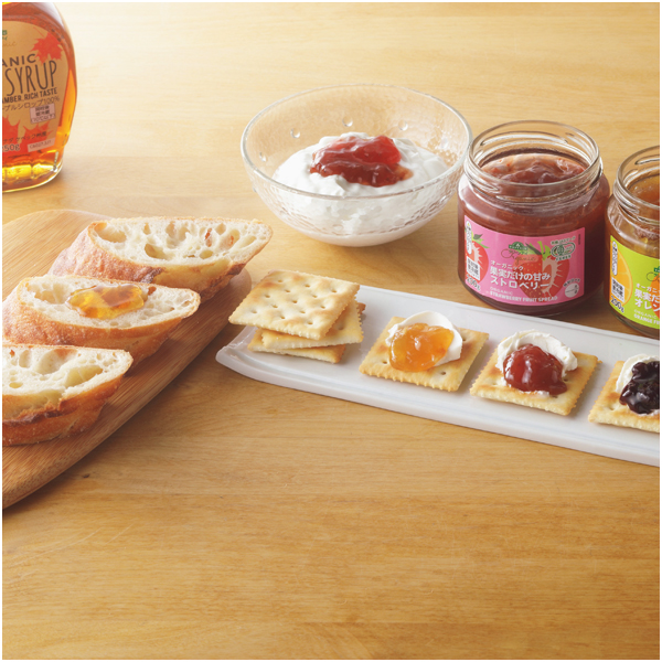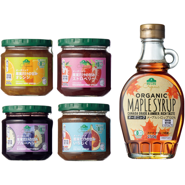 オーガニック フルーツスプレッド(オレンジ・ストロベリー・ブルーベリー・いちじく)各200g、オーガニックメープルシロップ250g