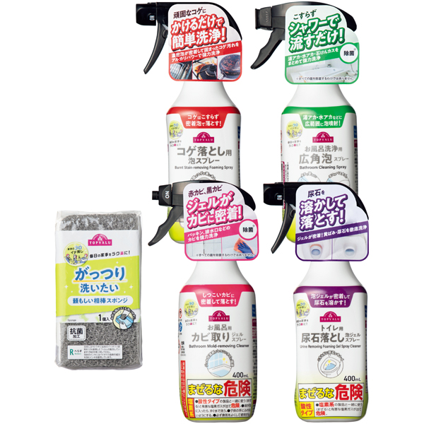 コゲ落とし泡・お風呂広角ミスト・お風呂カビ取りジェル・トイレ尿石落とし泡ジェルスプレー 各400ml、頼もしい相棒スポンジ