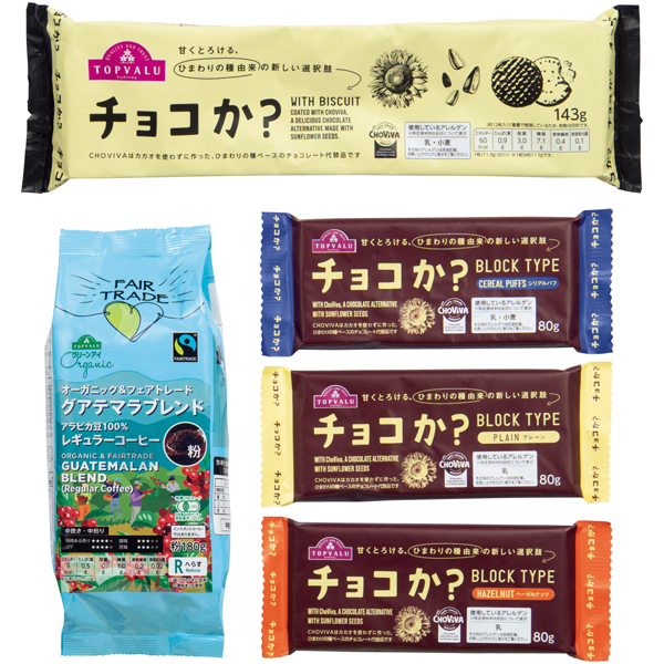 チョコか?WITH BISCUIT143g、チョコか?BLOCK TYPE(プレーン・ヘーゼルナッツ・シリアルパフ) 各80g、レギュラーコーヒー180g