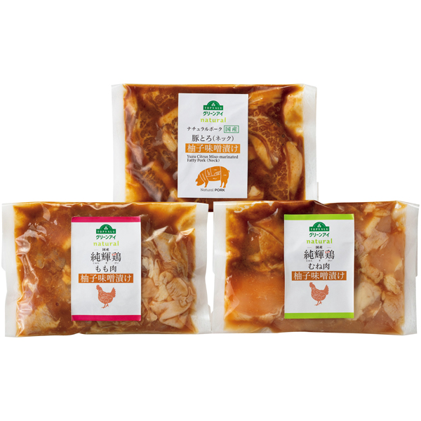 純輝鶏もも肉柚子味噌漬け200g、純輝鶏むね肉柚子味噌漬け200g、ナチュラルポークとんとろ柚子味噌漬け150g(各原料:肉/国産)