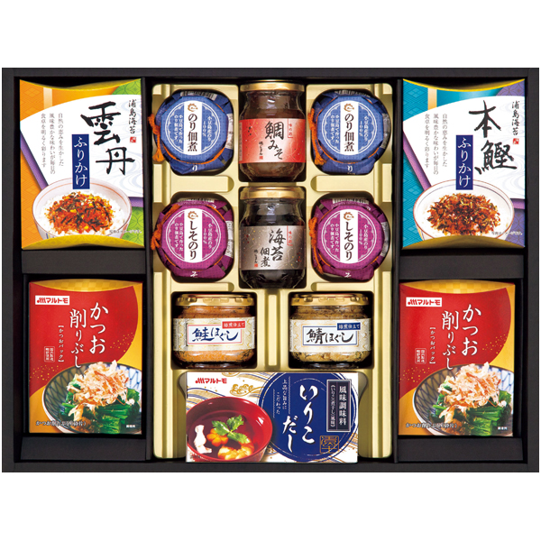 磯じまん(海苔佃煮90g、鯛みそ100g)、小豆島産佃煮(のり・しそのり)各80g×2、鯖ほぐし40g、鮭ほぐし40g、マルトモ(いりこだし8g×5P、かつお削りぶし1.5g×4P×2)、浦島海苔ふりかけ(本鰹・雲丹)各3.8g×4袋