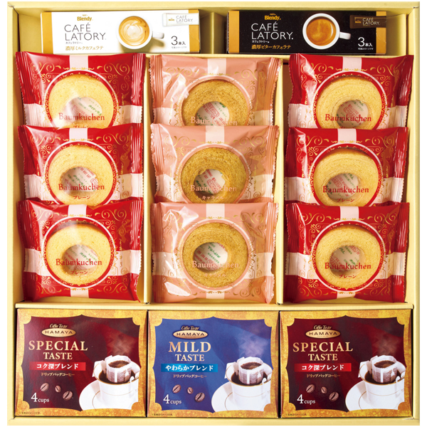東京バウムクーヘン(プレーン6、キャラメル3)、ハマヤドリップバッグコーヒー(やわらかブレンド・コク深ブレンド2)各8g×4P、カフェラトリー(濃厚ミルク10.5g・濃厚ビター9g)各3P