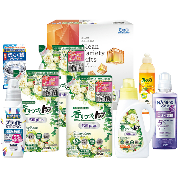 NANOXoneニオイ専用本体大型600g、香りつづくトップ抗菌plus(本体850g、詰替用500g×3)、ブライトストロング510ml、食器用洗剤オレンジ250ml、洗たく槽クリーナー