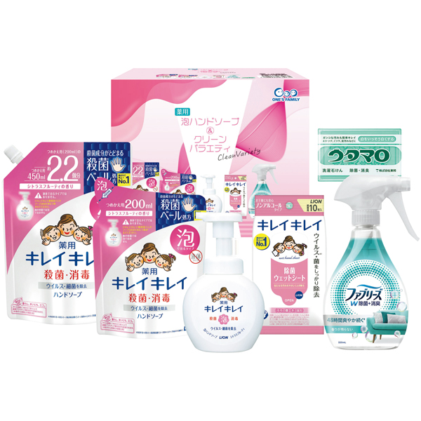 キレイキレイ薬用泡ハンドソープ(本体250ml、詰替用200ml、詰替用大型450ml)、キレイキレイウエットシート(ノンアルコール)10枚、ファブリーズW除菌本体370ml、ウタマロ洗たく石けん133g