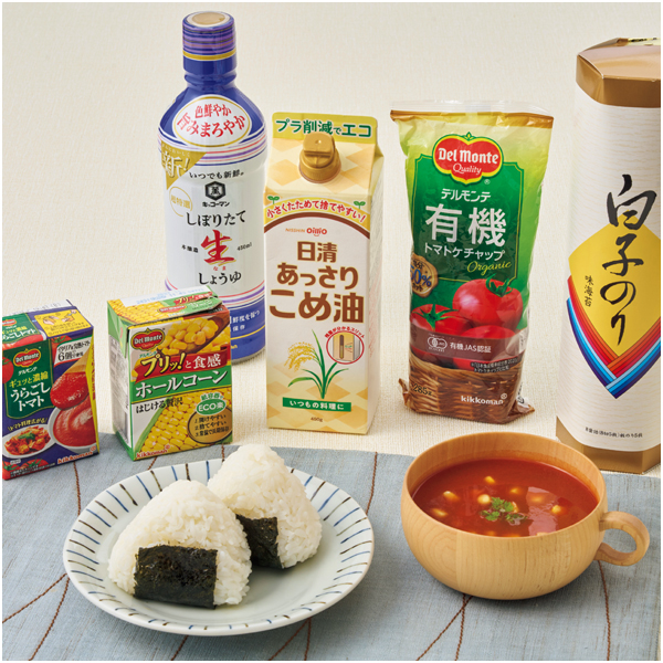 日清あっさりこめ油紙パック450g、白子のり味海苔(8切5枚×8袋)、いつでも新鮮しぼりたて生しょうゆ450ml、デルモンテ(ホールコーンはじける贅沢190g、有機トマトケチャップ285g、ギュッと濃縮うらごしトマト200g)