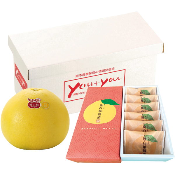 熊本県産「晩白柚」と、白餡の中に果肉や皮の粉末を使用し、まろやかな口当たりを楽しめる晩白柚饅頭をセットにしてお届けします。