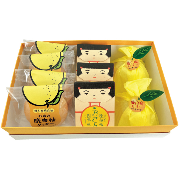 晩白柚Lサイズ1個(1.4kg以上)、晩白柚ゼリー2個、おきんゼリー3個、晩白柚クッキー4枚