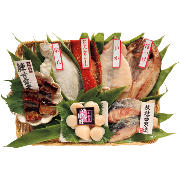 ほっけ開き150g、にしん味醂干し60g、開きいか干し70g、宗八ガレイ干し70g、秋鮭西京漬け120g(2切)、にしん甘露煮風80g、刺身用ほたて貝柱100g