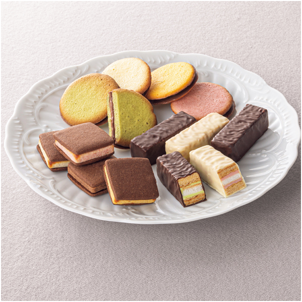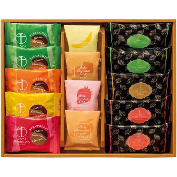 銀座ミルフィーユ(メロン2、ストロベリー2、プラリネ)、銀座焼きショコラサブレ(オレンジ、ストロベリー、バナナ、キャラメル)、銀座キャラメルショコラ(ピスタチオ2、ストロベリー、バナナ、オレンジ)