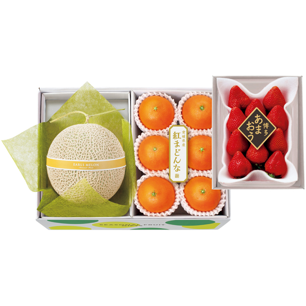 「あかい」「まるい」「おおきい」「うまい」の頭文字に由来する博多あまおうと、ゼリーのようになめらかな果肉が特徴の紅まどんな、丹精込めて育てたアールスメロン。人気のフルーツをセットにしました。