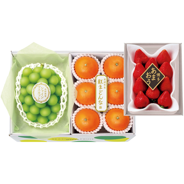 「あかい」「まるい」「おおきい」「うまい」の頭文字に由来する博多あまおうと、ゼリーのようになめらかな果肉が特徴の紅まどんな、皮ごと食べられるシャインマスカット。人気のフルーツをセットにしました。