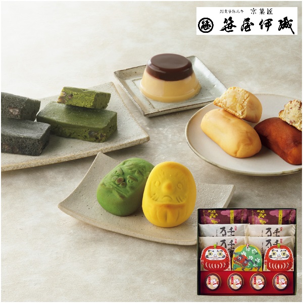 かわいらしいだるまや獅子舞をかたどったお饅頭や餡プリンなど人気の味を詰合せ。