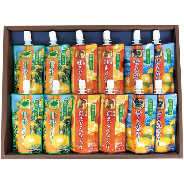 愛媛が誇る柑橘ブランド「紅まどんな」「せとか」「甘平」の飲むゼリー詰合せです。