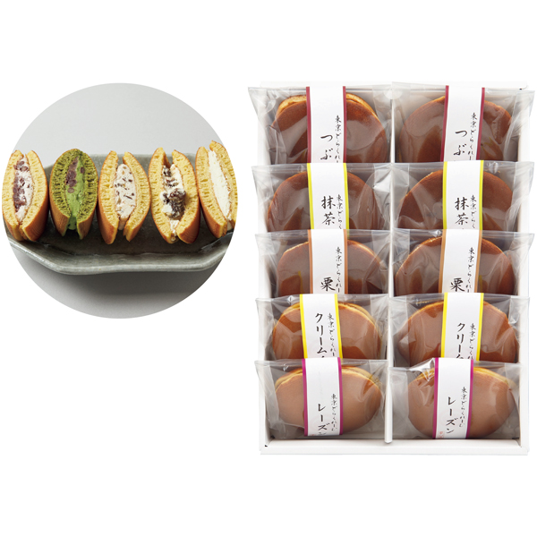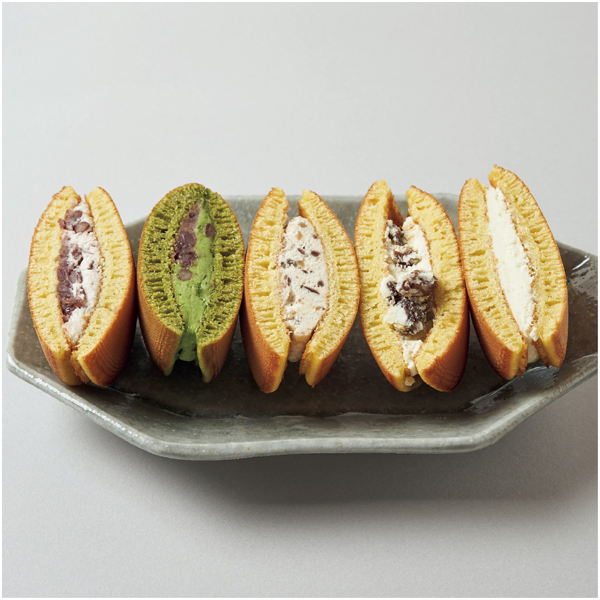 生クリームとつぶ餡、栗、レーズンなどをそれぞれ組合せ、ふんわりとした生地にサンドした生どら焼きです。