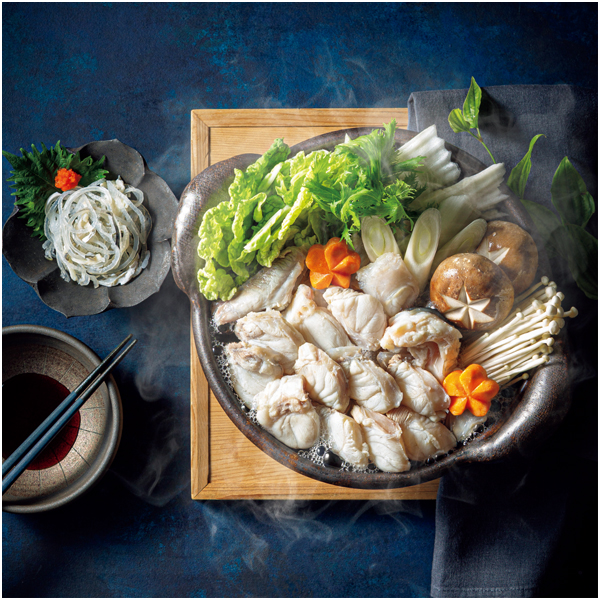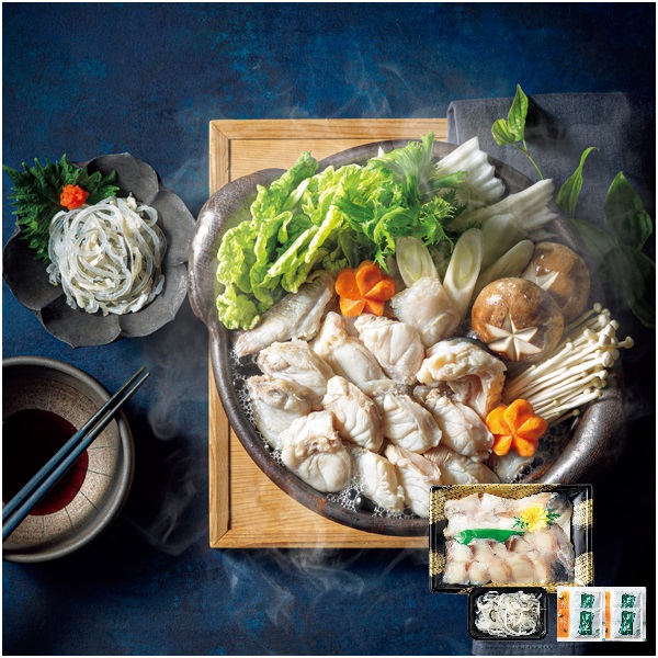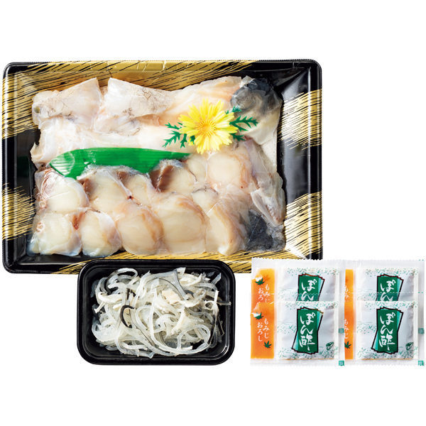 とらふぐ鍋用(身300g、アラ350g)計650g、湯引き皮75g、ぽん酢小袋・もみじおろし 各4(3~4人前)
