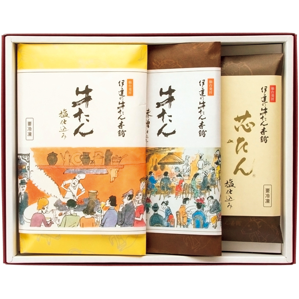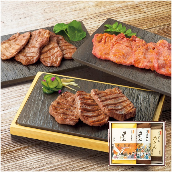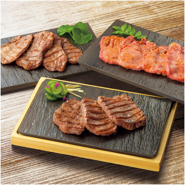 芯たん塩仕込み120g、牛たん塩仕込み100g、牛たん味噌仕込み100g(各原料:牛たん/ウルグアイ又はアイルランド産他)