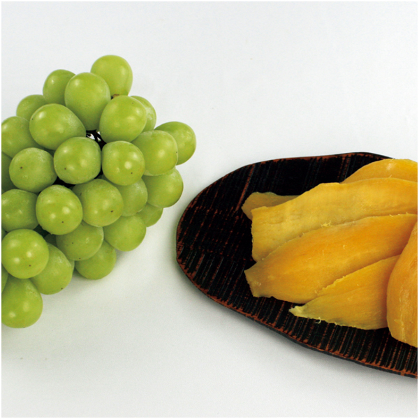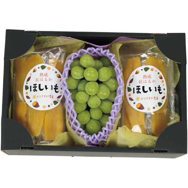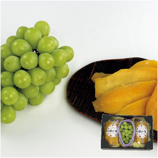 あっさりと甘いシャインマスカットと、ねっとりの食感の干し芋「紅はるか」の詰合せ。