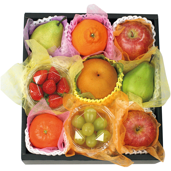 いちご70g(宮城県産)、シャインマスカット100g(福島県産)、サンふじ2個(1個275g以上、青森県産)、ラ・フランス2個(1個275g以上、山形県産)、和梨1個(300g以上、豊水又はあきづき又は王秋、福島県産)、デコポン1個(250g以上、熊本県産)、みかん1個(200g以上、愛媛県産)、各秀品
